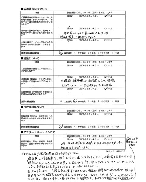 出棺式で再見積りをいただけると即答くださり(電話口にて)とても安心できました。
