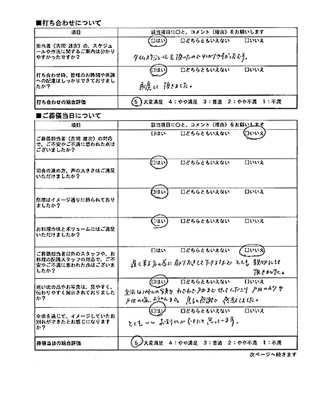 インターネットでの問い合わせから資料郵送まで迅速で、打ち合わせ時には不要な内容を見積りから省いて頂き助かりました。母との思い出などを上手くヒアリングされ、祭壇に反映いただき驚きました。近所の「かごの屋」の”かまめし”とお酒を祭壇に乗せていただきました。機転の利いたサービスに驚きました。ありがとうございました。当日の撮影いただいた写真のCDRを郵送されてきた事も良いサービスです。