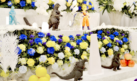 お式ではお母様とご長男様が故人様に寄り添ってお話しされていました。 式場にはご近所様や介護施設の方もお集まりいただき賑やかな雰囲気の中で開式いたしました。 お手向け品は、本、写真、手紙、服。サプライズでご用意させていただいたゴジラ映画のポスターは大変お喜びいただき、お母様とご長男様が「ほら、映画だよ!」とパネルを故人様にお見せになりながらお手向けいただきました。 お食事の折もご遺影に向かって「頑張ったんだね。一緒に食べようね」と優しくお声かけされていました。 ご帰宅の際にお母様とご長男様から丁寧なお礼のお言葉を頂戴いたしました。