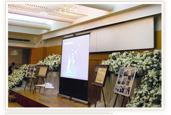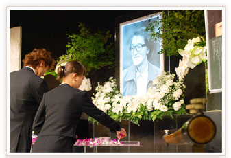 続いて、会場のお一人おひとりからの献花をご案内。水盆の上に、紫色のデンファレの花を浮かべていただく際、教え子の方々の目に涙が光っていました。「先生がいらっしゃらなければ、今の私はありません」「これからも天国から怒鳴ってくださいね」――。