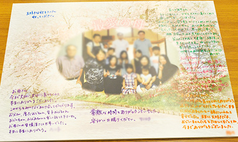 告別式前日にご家族がお集まりになり、祭壇をご覧になられ、「奇麗だね」とお話しされているのが印象的でした。 旅支度を皆様で涙を流しながらお手伝いをされていました。 ご家族の想いが強いご家族様でしたので、少しでもその想いをお伝えいただきたいと思い、ご家族の写真をメインにしたメッセージパネルを作らせていただき、告別式会式前に、皆様に一言お書きいただき、お柩の中へお手向けいたしました。 式前や式中涙を見せられる方も見られ、悲しみはとても深かったのではないかと思います。