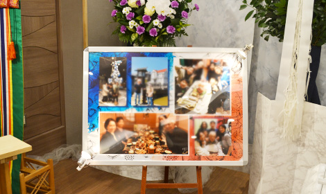 お打ち合わせ、そして、当日ともにご家族様にたくさん考えていただいて、空間・時間を一緒に考えさせていただきました。 日々、お仕事にお食事にとご家族のために精一杯、誇りを持って頑張ってこられた故人様への1番の恩返しは、「故人様のことをたくさん想って、考えていただくこと」でした。 式場には料理人の仕事道具を数多くご持参していただき、故人様のお近くにお飾りさせていただきました。 また、思い出パネルとして、お食事の時のお写真などをデザインさせていただき、ご用意いたしました。 ご家族様だけのご葬儀だからこそ、日頃のお食事の時のような安心した雰囲気でのお見送りとなりました。