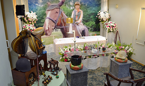 ご家族は故人様が送ってこられたイラスト付きの封筒をすべて大切に保管されていました。 そんな大切なご長女様のお見送りに際し、まず乗馬しているお写真の中で最も故人様らしいものをお選びいただきました。 そして、当日には乗馬で使っていた鞍やブーツなどもご用意していただき、式場にお飾りさせていただきました。 また、お柩の中には大好きなネギトロ巻きや未読の漫画本などをお入れしていただきました。 最後にこちらからメッセージボードを用意し、ご家族に今のお気持ちを込めていただき、故人様へお届けいたしました。 ご家族だけのお時間だからこそ、包み隠さずにお気持ちを存分に伝えていただくお時間となりました。
