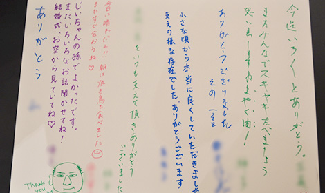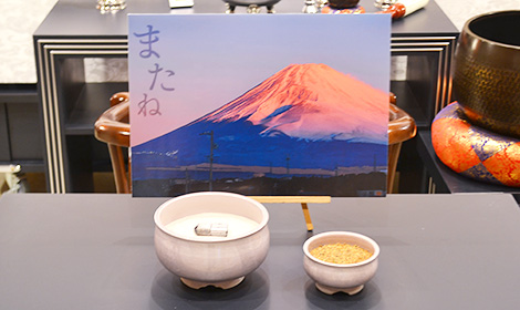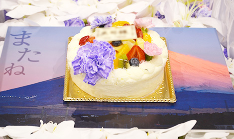 照明が落ちた式場に、蝋燭に灯された火が運び込まれます。 弊社でお手配した誕生日ケーキはタイミングをみて、バースデーソングとともに、ご家族のもとへ。 「わあ綺麗!」「すごい!」とお喜びいただけたご様子でした。 ご家族に火を消していただき、男手ひとつで息子様を育て上げた故人様に、誕生日ケーキをお柩の中へお手向けしていただきました。 今まで言いたくても言えなかった感謝と誕生日おめでとうのお気持ちと涙を一緒に。 そして、当日はお孫様が手作りのフォトブックにメッセージを書けるようにご用意してくださいました。 さらに、弊社で制作した富士山のパネルにも、故人様へのメッセージを書いていただきました。 お気持ち溢れる温かいお別れの中、ご参列されたご親族から、「元気な頃はよくお酒も飲んでたな」とのお言葉が。 そこで、日本酒を用意し、その場で献酒という形で故人様のお口元にお酒も運んでいただきました。 想いを綴ったメッセージとバースデーケーキ、そしてお酒とたくさんの感謝のお気持ちでお見送りするお時間となりました。