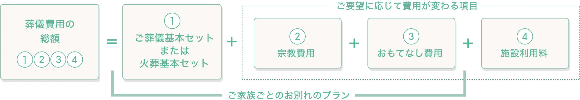 故人様のためにお選びいただくお骨壺、お棺、参列者様や宗教者様へのお料理や返礼品など。ご家族様のご要望に応じて、必要なものを必要な分だけ、基本セットへの組み合わせや追加ができます。