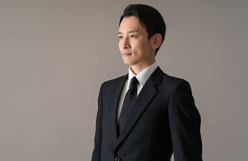 男性の喪服は、基本的に黒のブラックスーツを着用します。