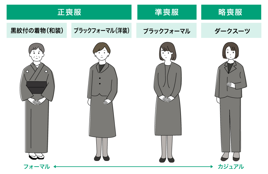 | 略喪服 | 友人・職場関係など一般参列者 | 黒や濃紺などの地味なスーツやセットアップ、若干の自由度あり |