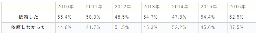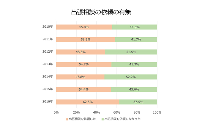 首都圏の葬儀に関する情報を発信するエンディングデータバンクによると、葬儀を行った方のうち、万が一に備えて出張相談を依頼した方が、2010年から2015年までは5割前後で推移していましたが、2016年には6割を超えました。