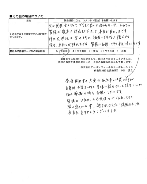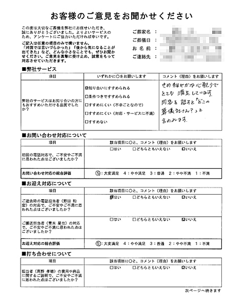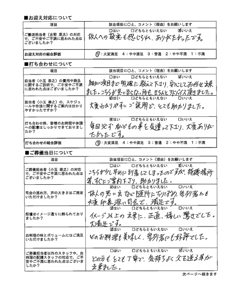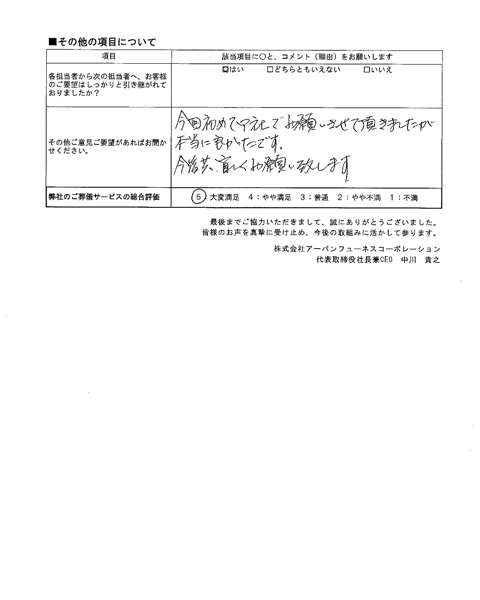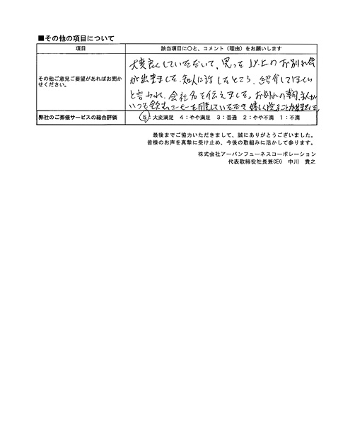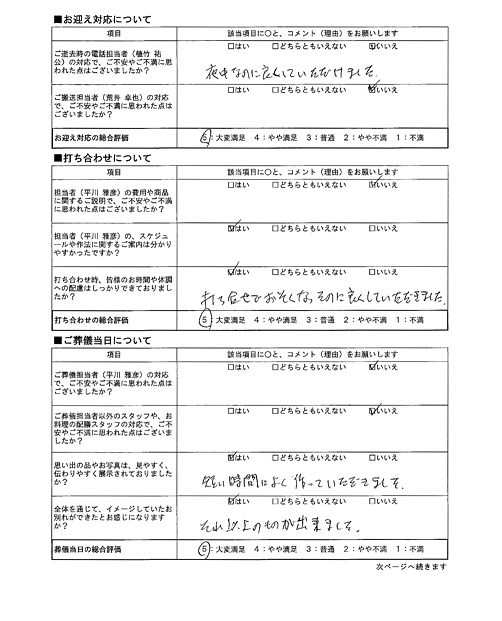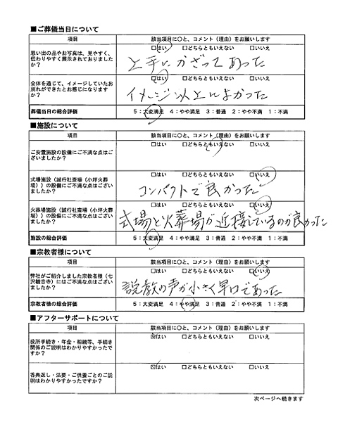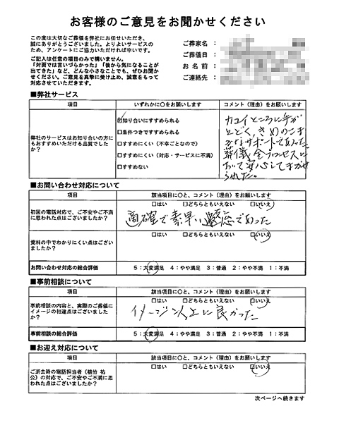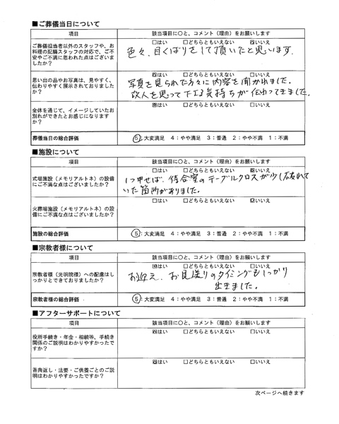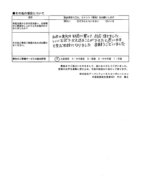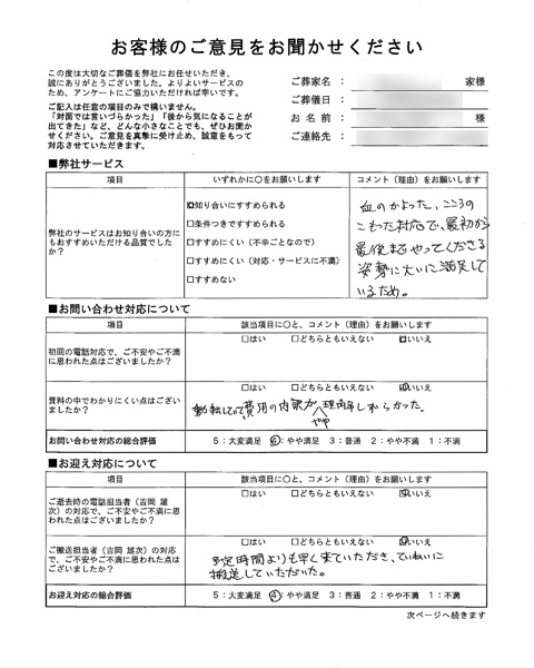 昔ながらの葬儀を望んでる人以外にはすすめられる。今回、友人が貴社で行ったお葬式の話を聞いて決めさせていただきました。