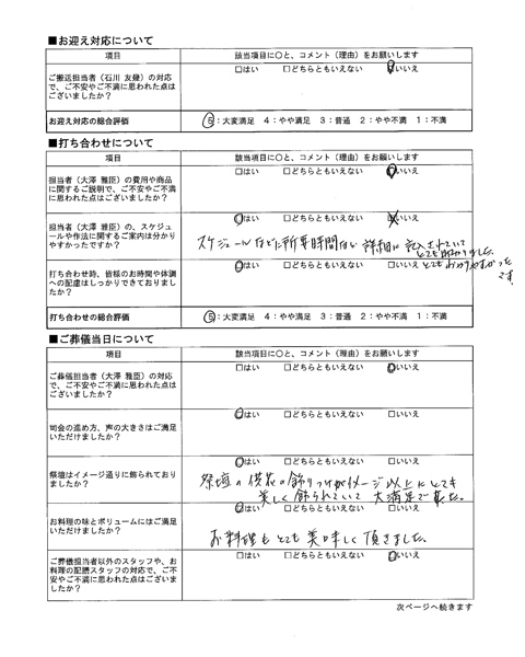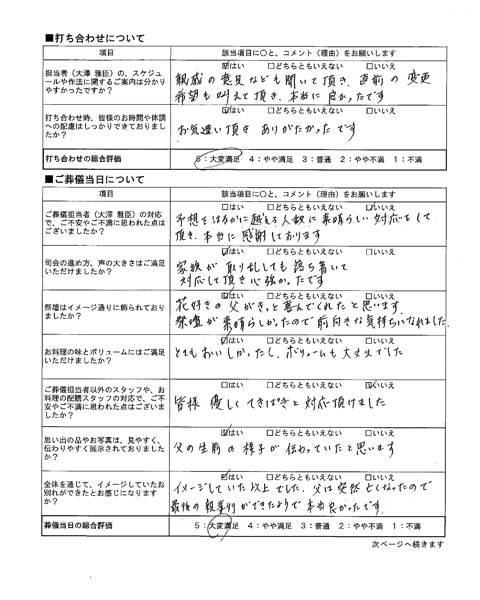 案内のみならず、「お別れ」の時間を長めにとってくれる配慮は、葬儀の流れをイメージしやすいように具体的な説明がとても分かりやすかった。